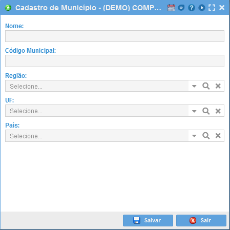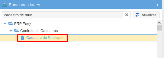 Acesse a tela de "Cadastro de Município", conforme mostrado abaixo.