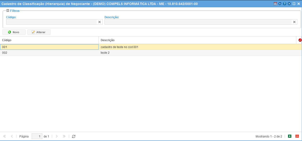 Após acessar será mostrada uma tabela com todos os negociantes cadastrados e suas classificações, sendo assim possível alterar um negociante já existente ou incluir um novo negociante. * Utilize os filtros para pesquisar um negociante específico.