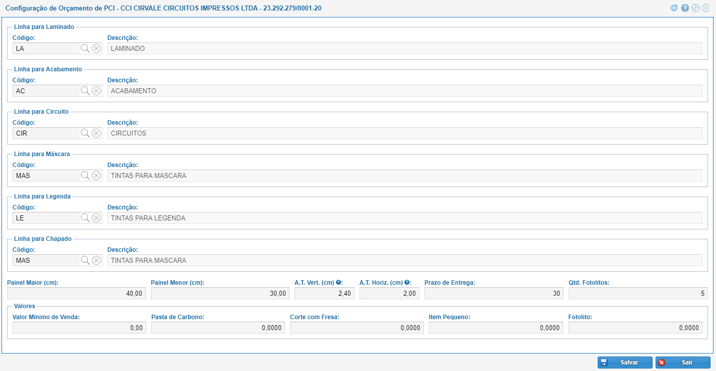Para o Orçamento de PCI deve-se informar seis linhas distintas que são: Laminado, Acabamento, Circuito, Máscara, Legenda e Chapado.