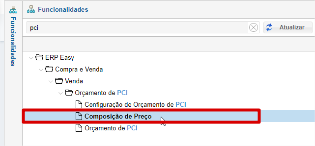 A Composição de Preço juntamente com a Configuração de Orçamento de PCI são cadastros preliminares do Orçamento de PCI. Ambos devem estar corretamente configurados para que o sistema faça o cálculo correto do Orçamento.