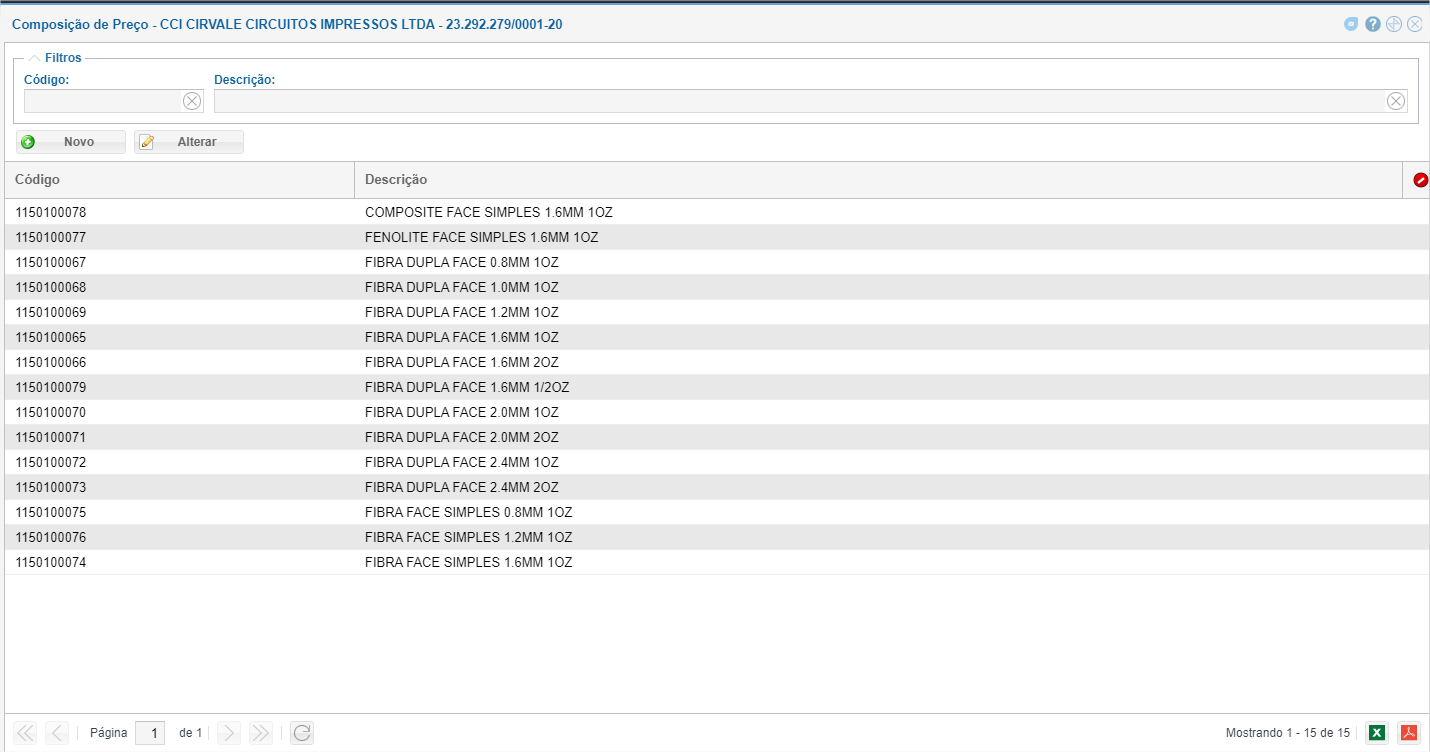 A tela seguinte apresenta todas as Composições de Preço cadastradas. Para alterar, dê duplo clique na Composição desejada ou selecione e escolha a opção "Alterar". Para cadastrar uma nova Composição, clique no botão Novo. Vale ressaltar que apenas uma Composição deve ser cadastrada por item da linha Laminado.