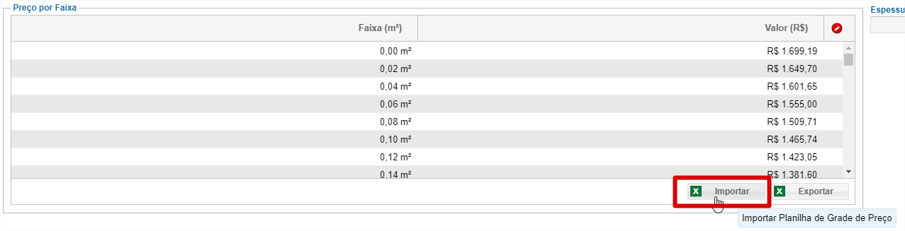 No "Preço por Faixa", deverão ser cadastrados o preço para cada m² do laminado. Para facilitar o cadastro, utilize a opção "Importar".