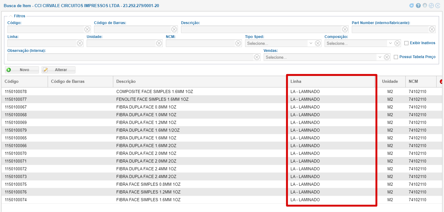 No cadastro da Composição de Preço, informe o item da Composição. Ao clicar na "Lupa" o sistema abre a tela de Cadastro de Item e filtra apenas os itens da linha Laminado.