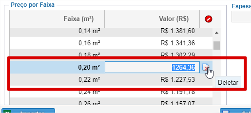 É possível alterar a Faixa (m²) e o Valor (R$) do laminado, como também é possível excluir a linha.