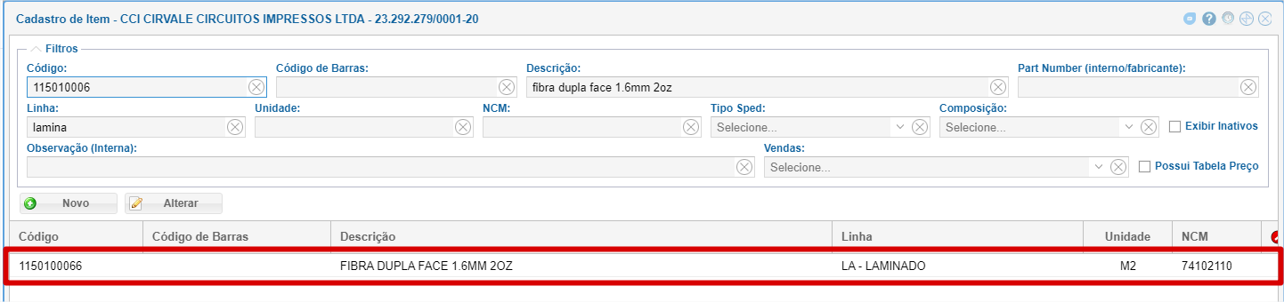 Exemplo: o item Fibra Dupla Face 1.6mm 2oz é da linha laminado
