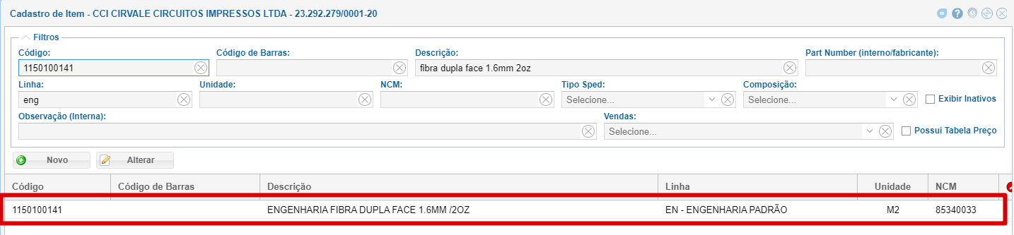 Para este laminado, é necessário cadastrar um outro item, desta vez na linha de Engenharia Padrão.
