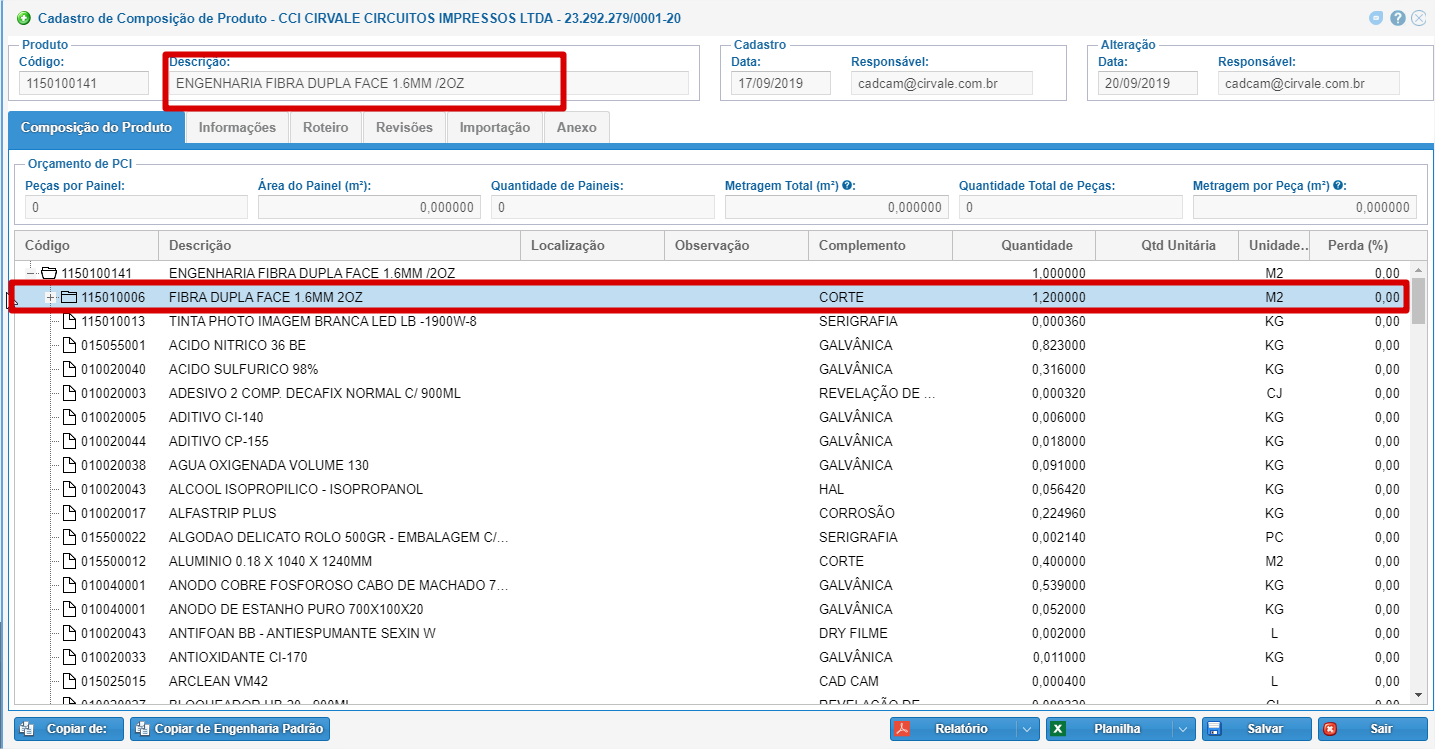 Ao editar o item da linha Laminado, é preciso marcar a opção de "Laminado para Engenharia Padrão de PCI".