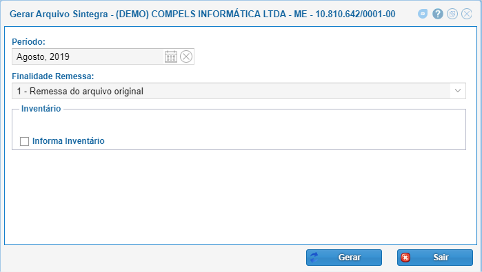 Informa Inventário: Se for necessário informar o estoque para que vá junto ao arquivo Sintegra, marque essa opção e defina o período.