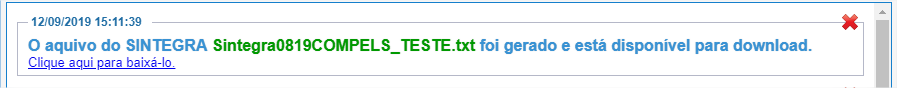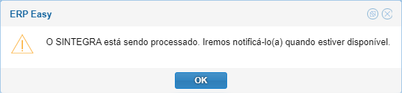 Após inserir os dados para geração, clique em "Gerar" e aparecerá a informação de que o Sintegra está processado e que será notificado quando disponível, conforme imagem abaixo.