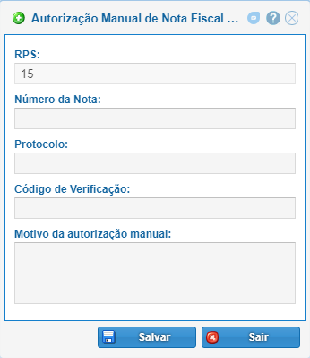 Preencha os dados de Número da Nota, Protocolo e Código de Verificação de acordo com os fornecidos pelo sistema da prefeitura. Preencha o Motivo da autorização manual da Nota e clique em "Salvar".