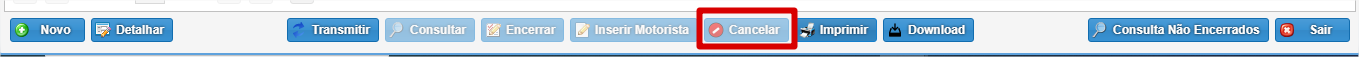 Selecione o MDF-e e clique em "Cancelar". A coluna "Status" deve apresentar a mensagem “Cancelamento de MDF-e homologado".