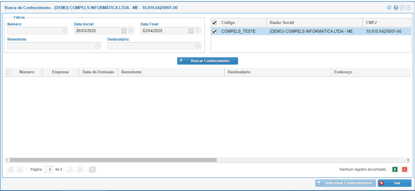 Adicionar Conhecimento: Lista os conhecimentos (CT-e's) para importar para o romaneio, para isso é necessário selecionar os conhecimentos que serão vinculados ao Romaneio e clicar em "selecionar conhecimentos".