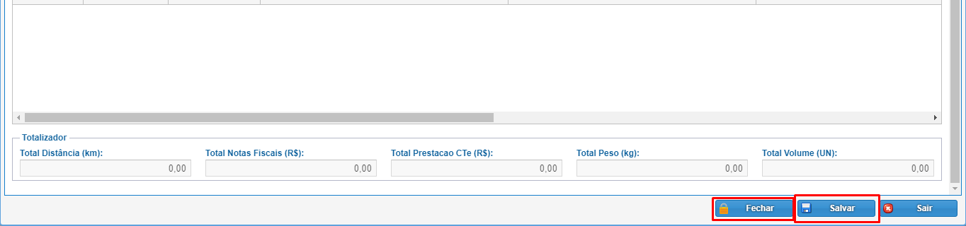 Totalizador: Nesse campo são informados os valores referentes ao Romaneio. Com o romaneio já finalizado basta clicar em "fechar", caso ainda precise realizar alteração, utilize o "salvar".