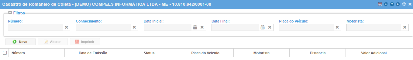 Na tela inicial do romaneio, é possível visualizar os romaneios já cadastrados. Utilize os filtros para refinar as buscas.