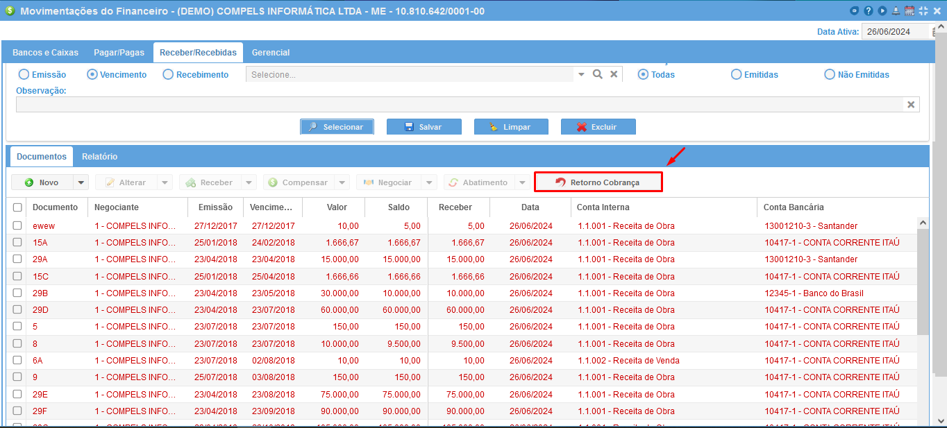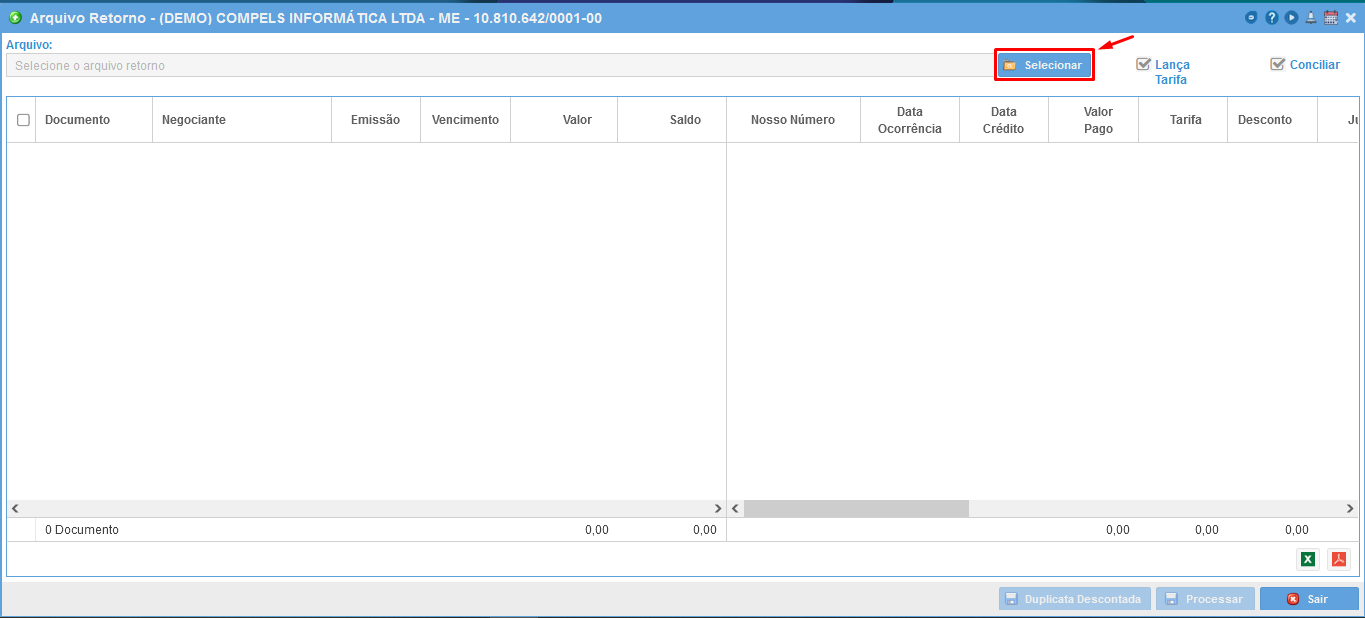 Para realizar o recebimento das duplicatas pelo arquivo retorn o, clique no botão destacado abaixo.