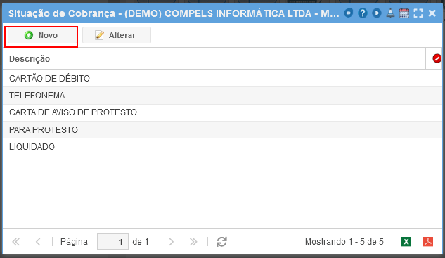 Ao acessar a funcionalidade, a seguinte página será apresentada onde será listados os tipos de cobranças já cadastrados. Para realizar um novo cadastro, clique em "Novo".