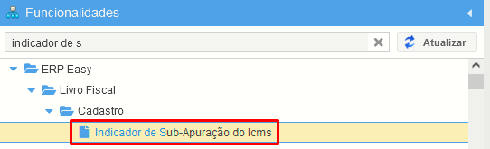 Para cadastrar um indicador de Sub-Apuração que será utilizado no registro 1900 da EFD ICMS/IPI, acesse no menu de funcionalidades a opção: "Indicador de Sub-Apuração do ICMS"