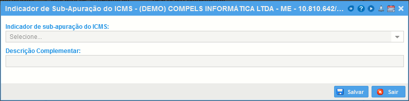 Ao acessar esse menu, clique no botão "Nova" e efetue o cadastro de um novo indicador de sub-apuração e uma descrição complementar.
