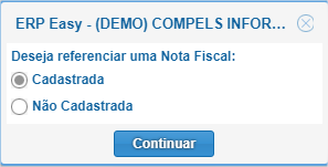 Clique no botão "Adicionar" para referenciar outra Nota Fiscal. O Sistema irá pergunta se a Nota Fiscal a ser referenciada é cadastra ou não no Sistema. Se for uma Nota cadastrada a chave de acesso e os demais campos são preenchidos automaticamente. Se for uma Nota não cadastrada, insira a chave de acesso e os demais campos manualmente.
