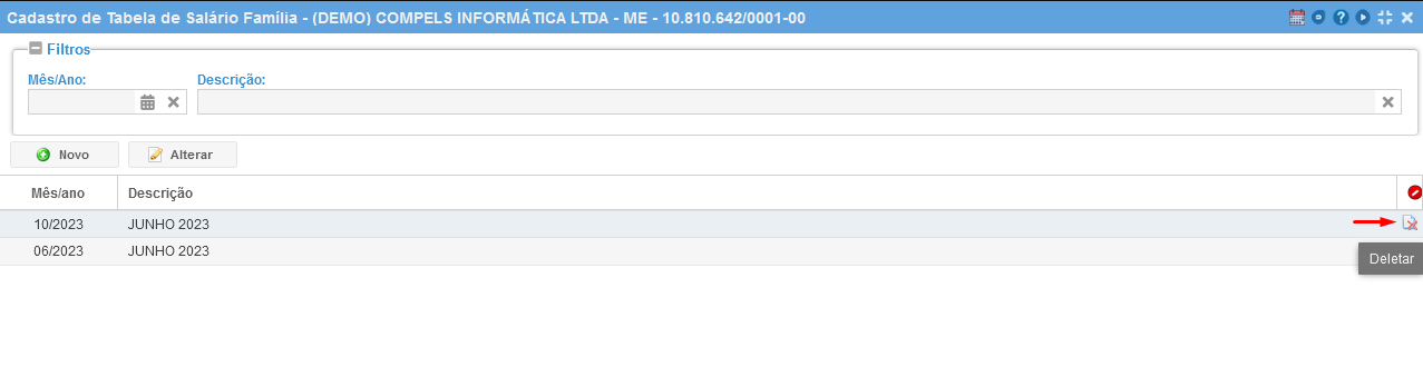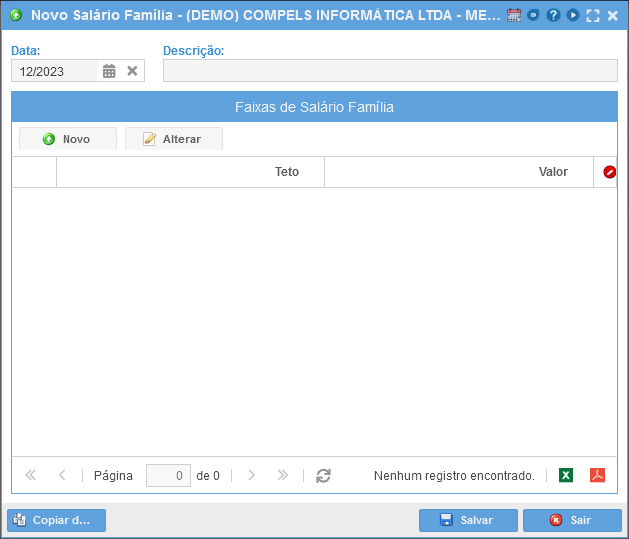 Após informar os dados acima, é necessário clicar em "Novo" e preencher os campos das Faixas de Salário Família: