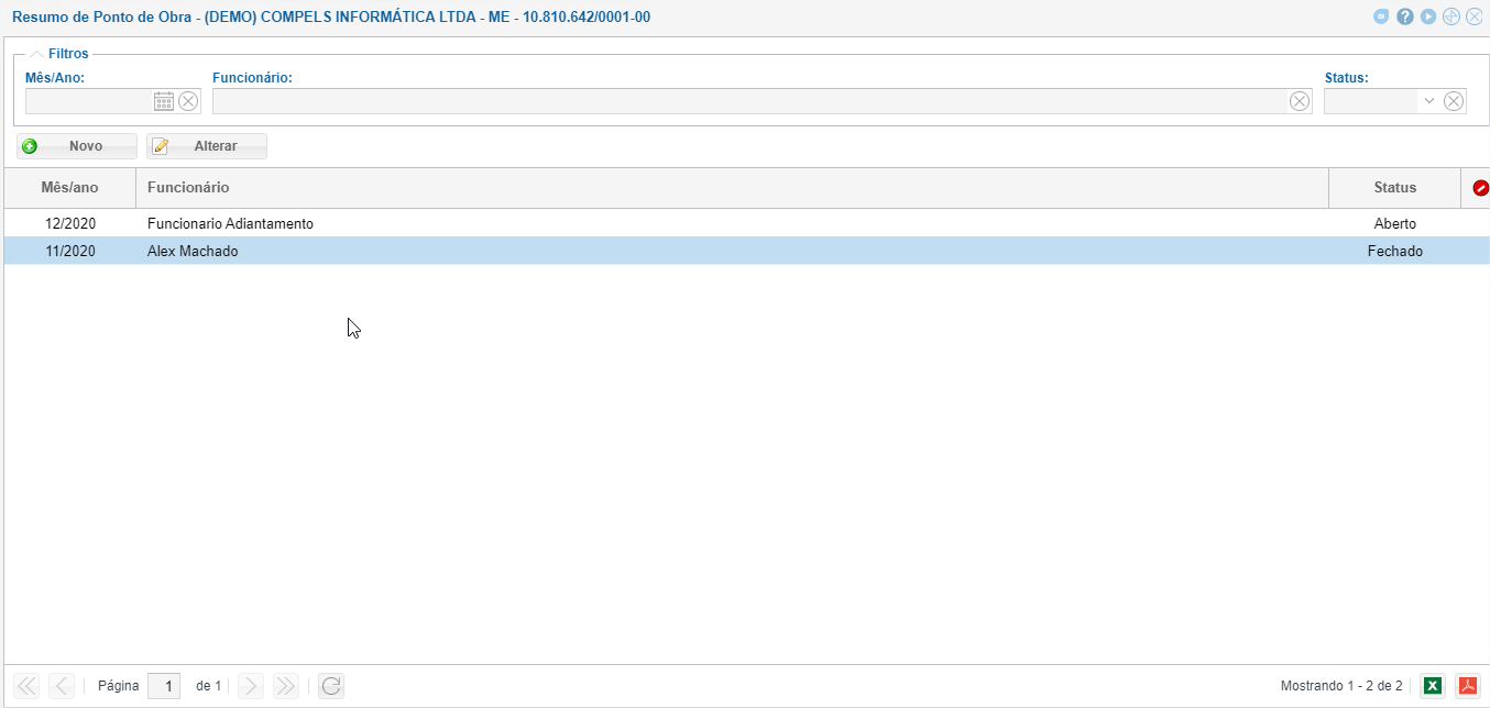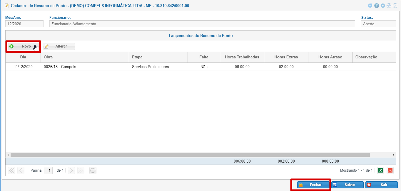 Insira o Mês/Ano e o Funcionário. Clique no botão "Novo" para inserir o Lançamento.