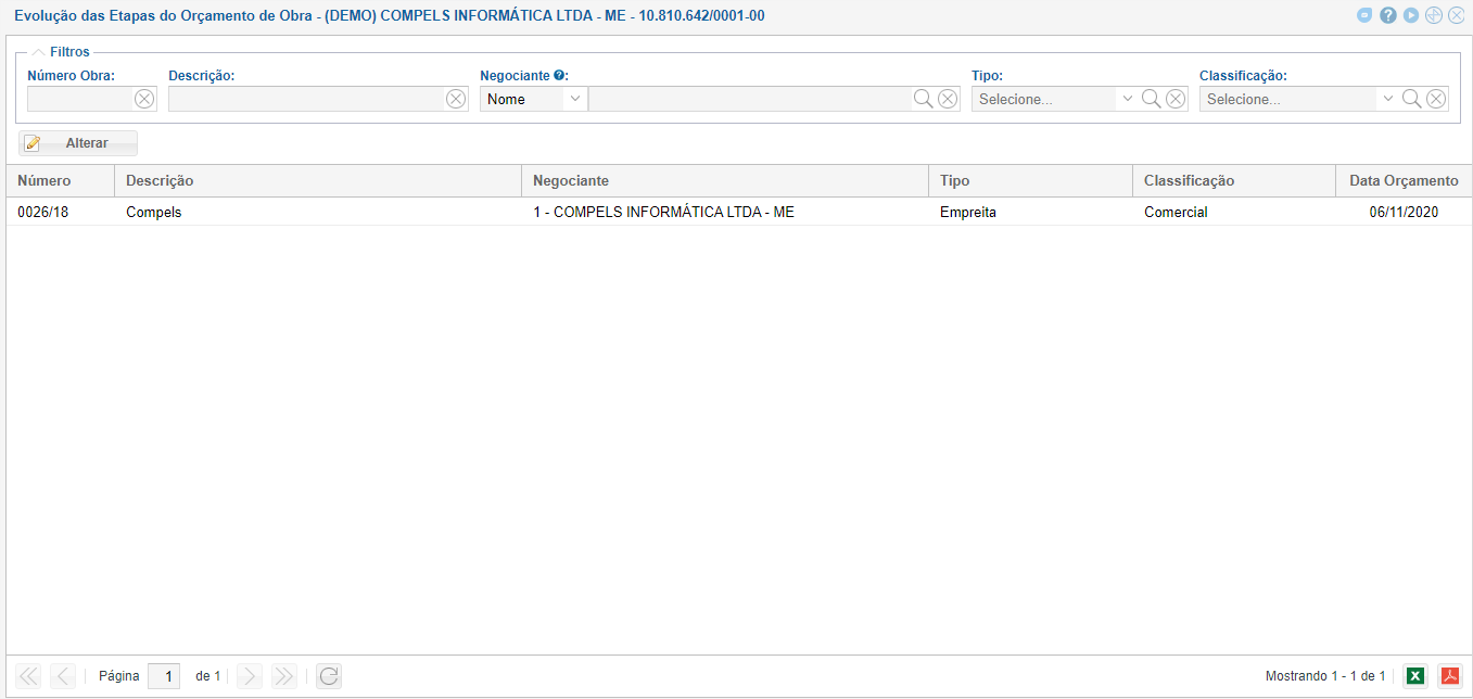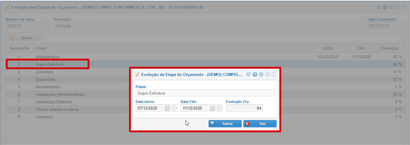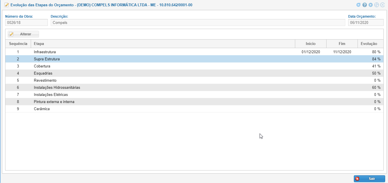 Para alterar a evolução da Obra, selecione e clique em "Alterar" ou dê duplo clique na linha.