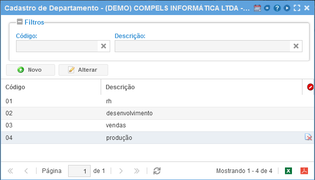 Ao acessar a função, estará listada todos os Departamentos já cadastrados. É possível pesquisar os Departamentos utilizando os filtros disponíveis.
