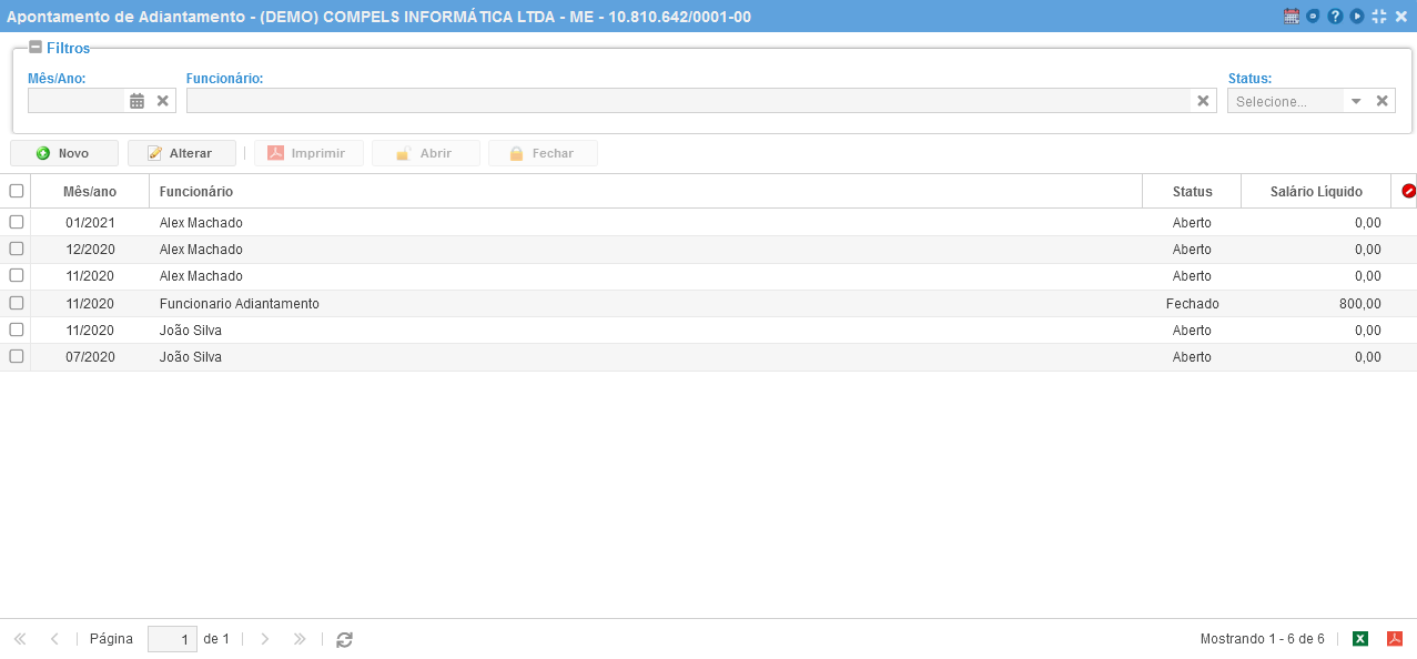 Para realizar um novo apontamento de adiantamento clique em "Novo" e selecione a opção desejada.
