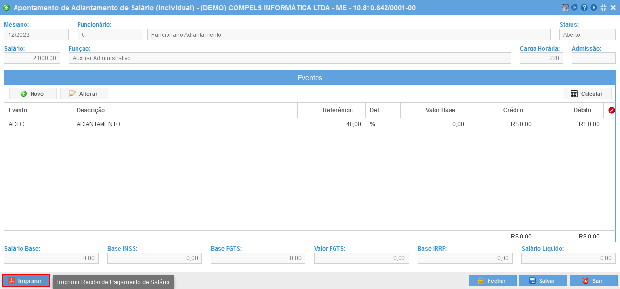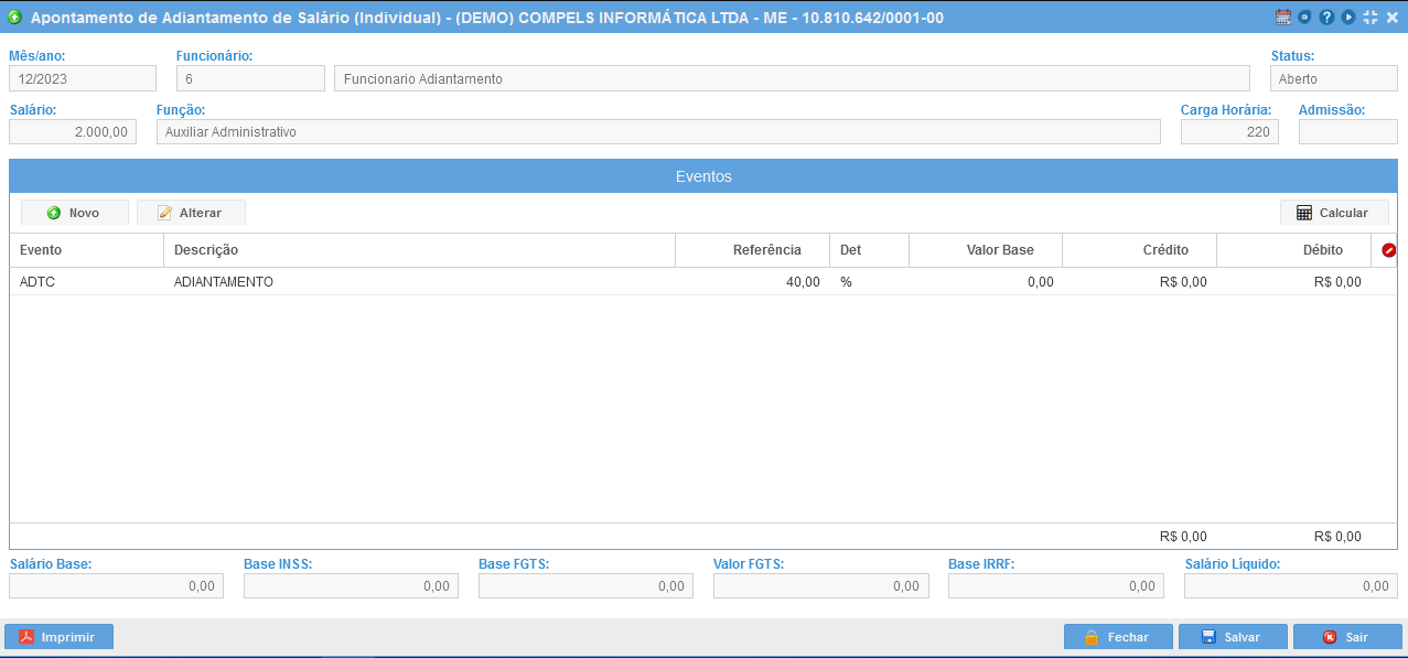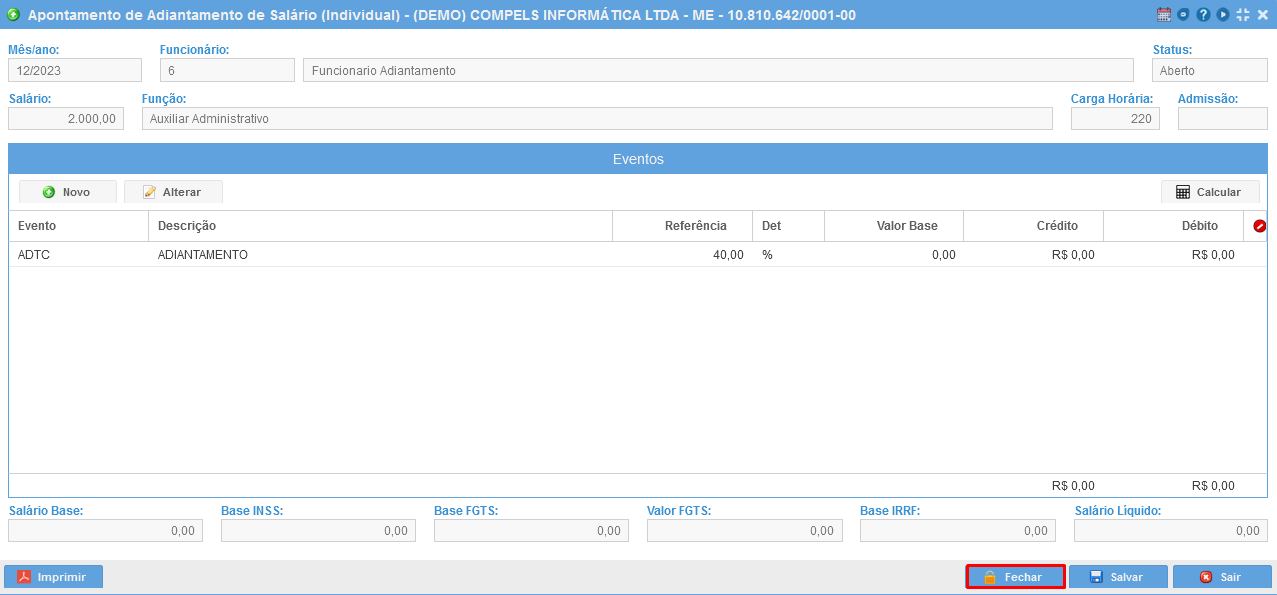 Após clicar em eventos fixos o sistema trará os valores já calculado do adiantamento, que é 40% do valor total do salário. Lembre-se que este valor percentual foi definido ao adicionar o evento fixo ADTC no funcionário.