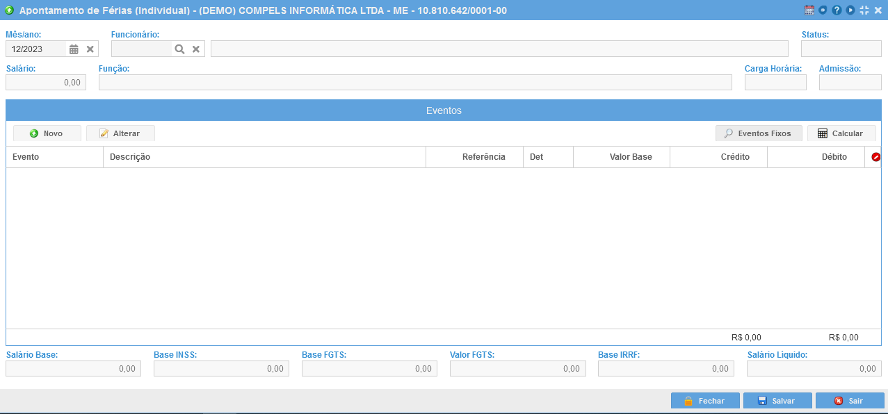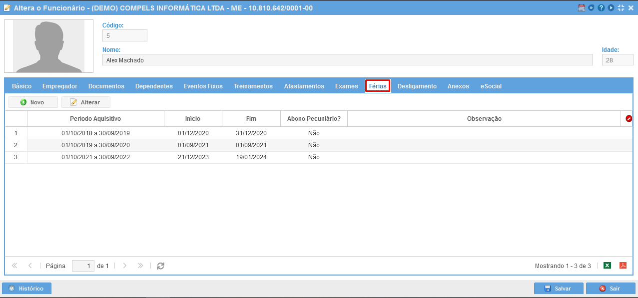 Para realizar o apontamento, é exigido que seja inserido o vínculo de férias no cadastro de funcionário na aba férias.