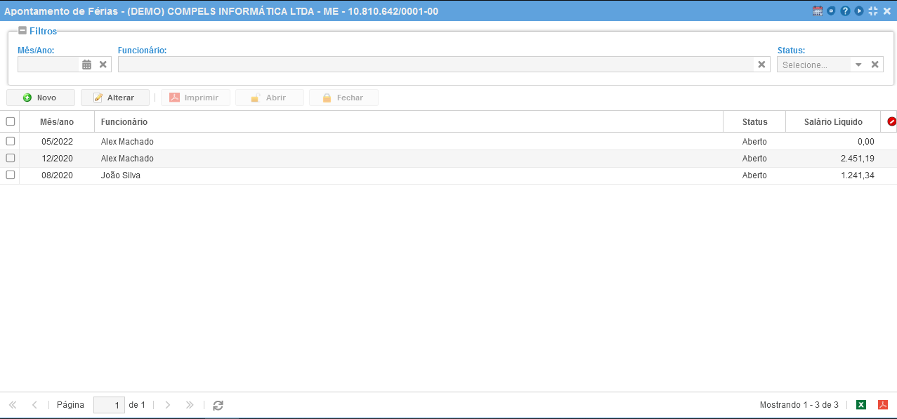 Ao acessar a página, serão listadas todas as férias já apontadas. Com os filtros disponíveis é possível buscar as férias já apontadas.