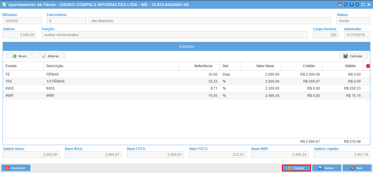 O sistema irá calcular as férias e lançar os seus respectivos eventos, permitindo ainda que sejam inseridos novos eventos manualmente: