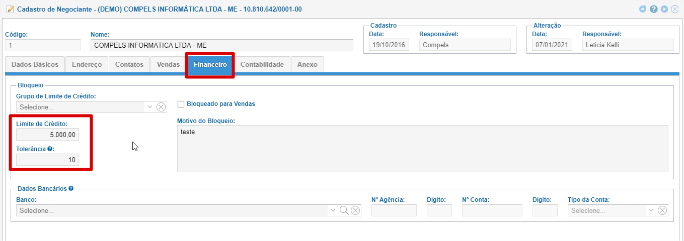 Tanto o limite de crédito quanto a tolerância são configurados no Cadastro do Negociante, aba "Financeiro".