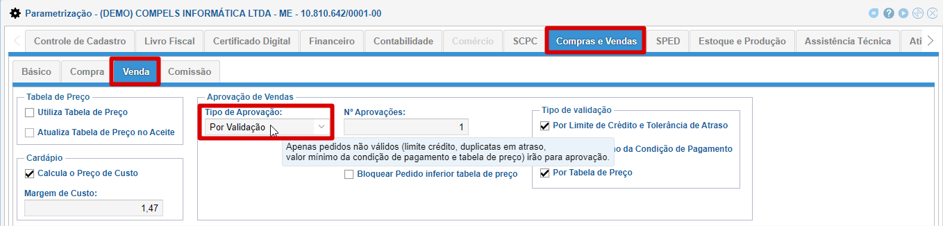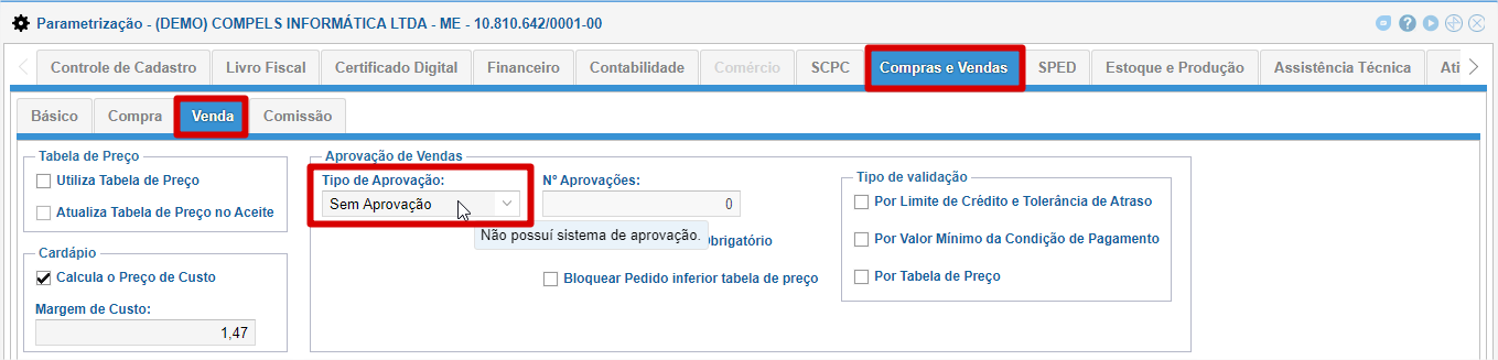 Os Pedidos de Vendas podem ter três tipos de aprovação, são eles: sem aprovação, todos os pedidos e por validação.