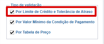 - Por Limite de Crédito e Tolerância de Atraso: neste tipo de aprovação, o ERP analisa se o cliente ultrapassou o limite de crédito disponível e/ou tem duplicatas vencidas que excederam a tolerância de atraso.