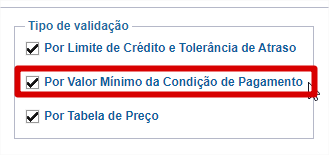- Por Valor Mínimo da Condição de Pagamento: nesta validação, o ERP verifica o valor total do pedido e se a Condição de Pagamento escolhida pode ser utilizada.