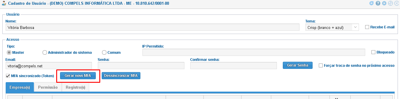 Um vez no cadastro do usuário, selecione a opção Gerar MFA.