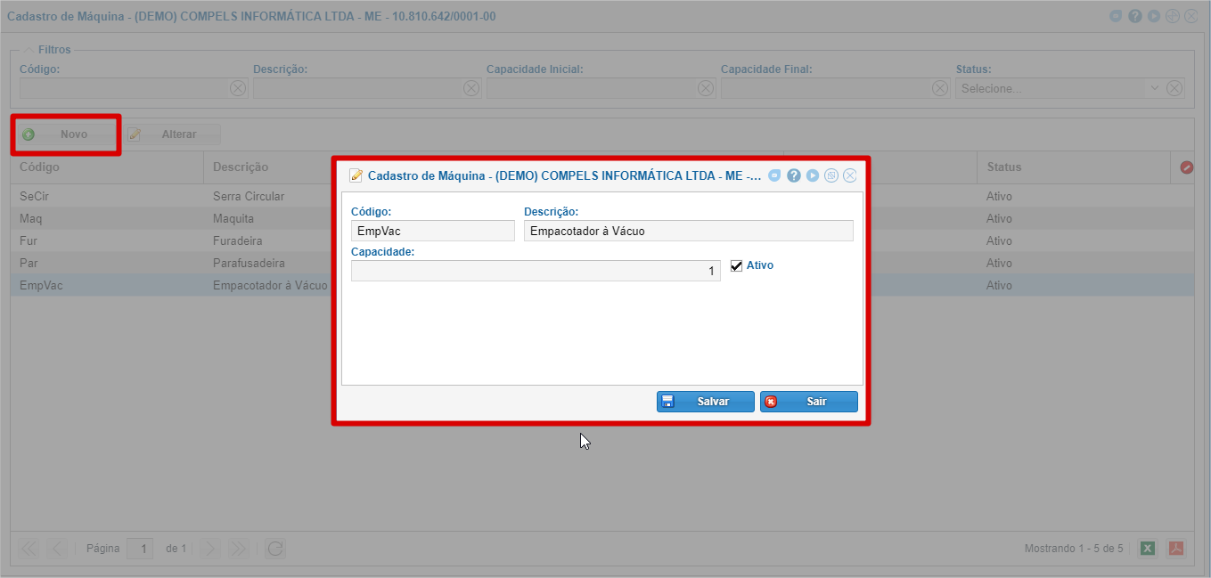 Clique no botão "Novo" para cadastrar novas máquinas.