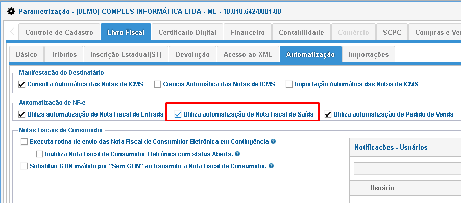 Dentro da aba "Automatização" serão feitas as configurações necessárias para a execução desse processo. Para isso é necessário a marcação no seguinte campo " Utiliza automatização de Nota fiscal de Saída"