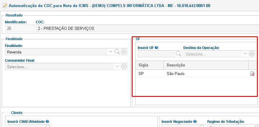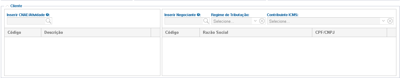 - Regime de Tributação: verifica a tributação do cliente vinculada ao cadastro do negociante.