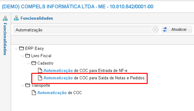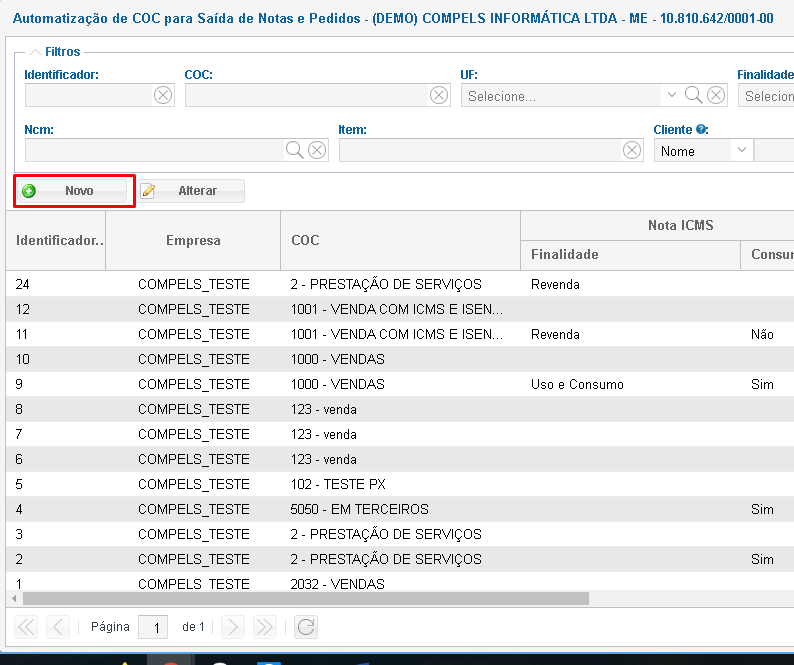 Agora, feita as configurações necessárias vá em " Automatização de COC para Saída de Notas e Pedidos" onde será possível visualizar as automatizações já cadastradas no sistema, como também cadastrar novas automatizações.