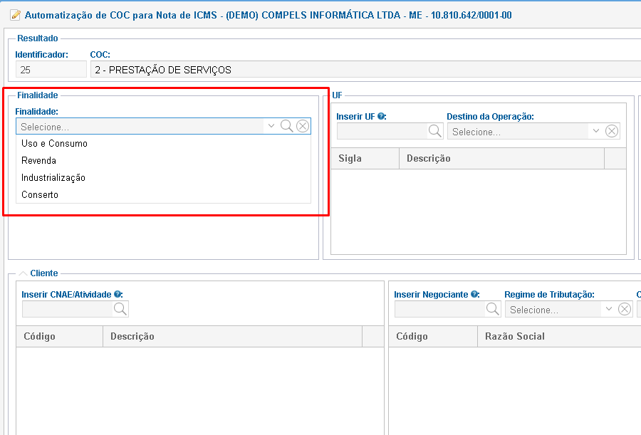- Finalidade: Desse modo especificando qual a finalidade escolhida na Nota;