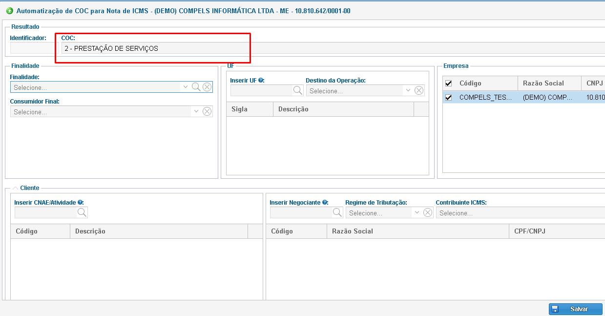 Após concluída esta etapa preencha o campo "COC" com o COC que será usado na Nota Fiscal se encontrado o conjunto de regras abaixo: