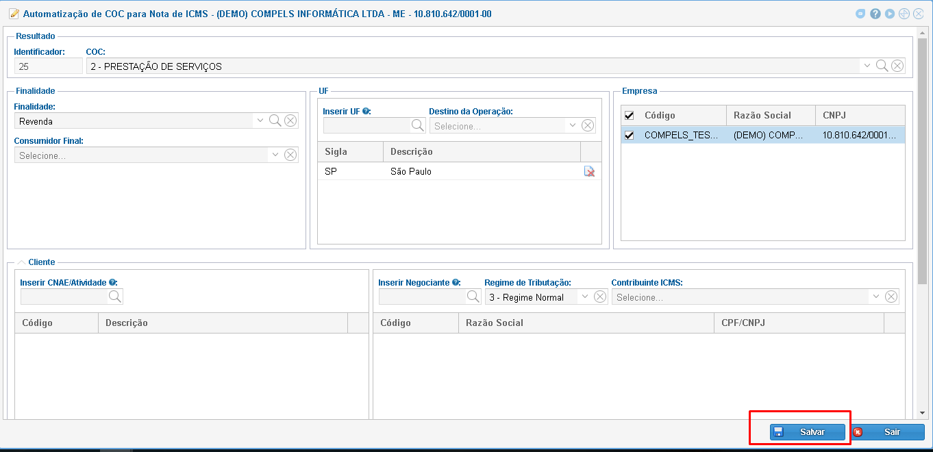 É importante destacar que quanto mais campos preenchidos na automatização, mais as regras irão se especificando para mais tarde comparar com as informações da Nota.