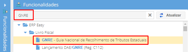 Após a solicitação ser aprovada, já é possível fazer a guia pelo ERP e transmiti-la ao portal de GNRE's. Para fazer a guia acesse a funcionalidade "GNRE - Guia Nacional de Recolhimento de Tributos Estaduais" conforme a imagem abaixo.