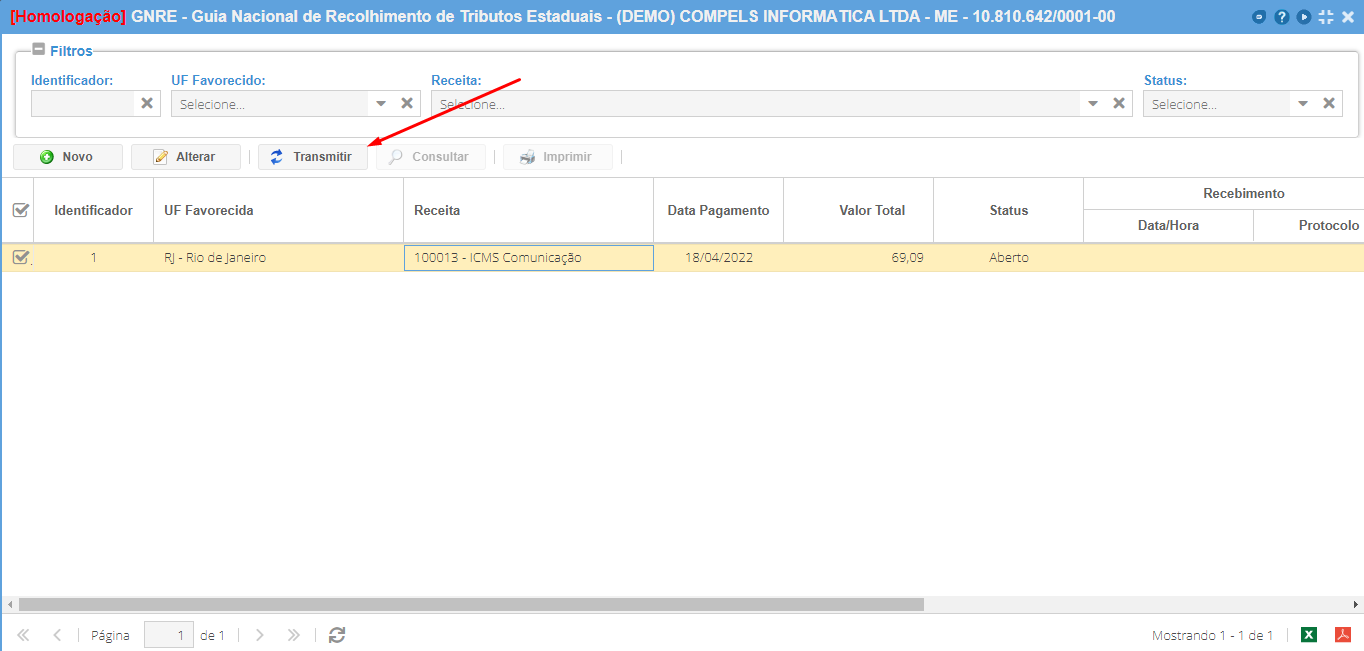 Após salvar a guia, o sistema voltará para a listagem de guias e é nessa tela que se faz a transmissão. Para fazer a transmissão, selecione a guia e clique em "Transmitir".