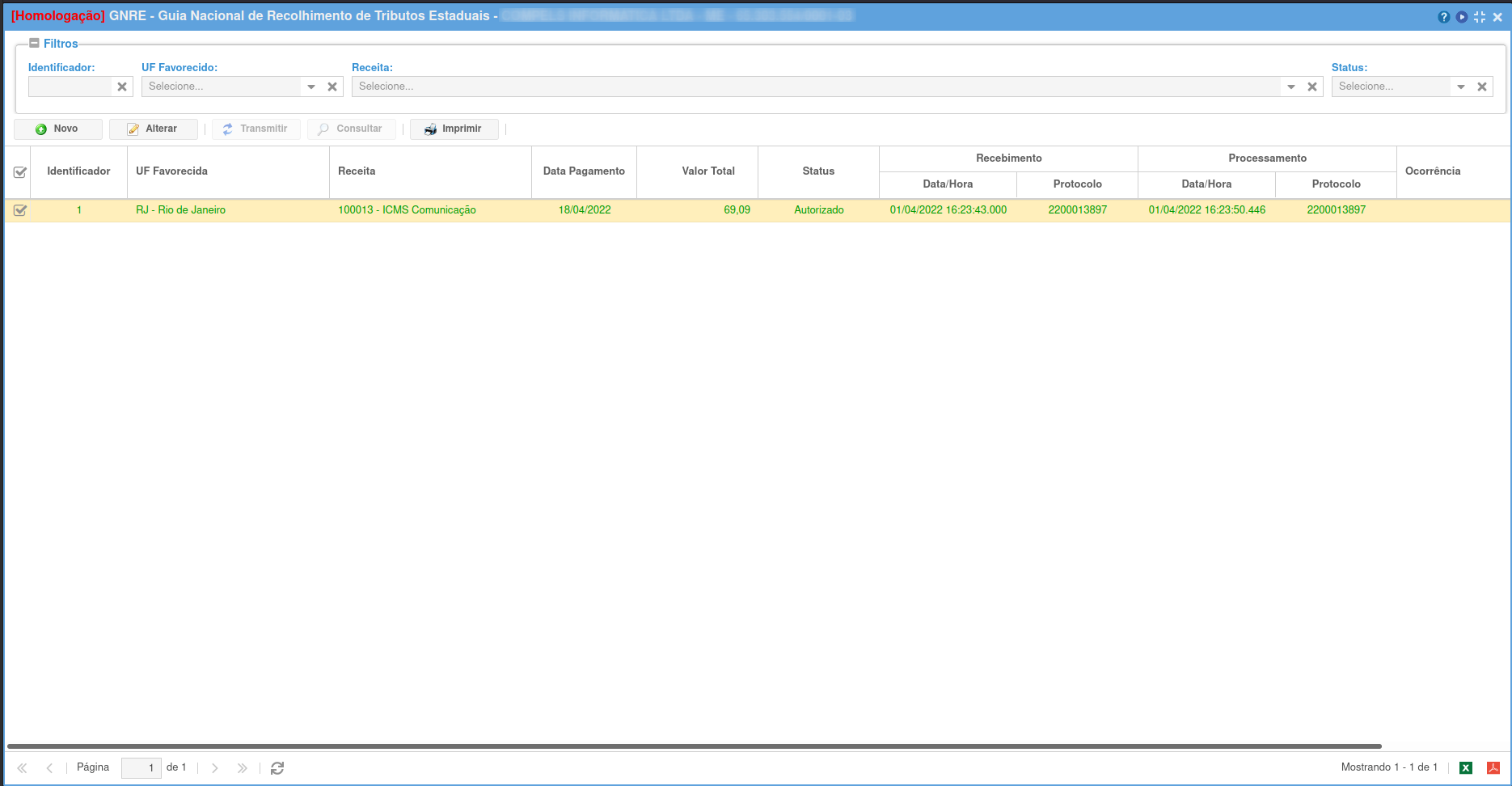 Após a transmissão, a guia mudará o status para "Autorizado", preenchendo automaticamente alguns campos após a transmissão, como: Data/Hora do recebimento, Protocolo do recebimento, Data/Hora do processamento e Protocolo do processamento.