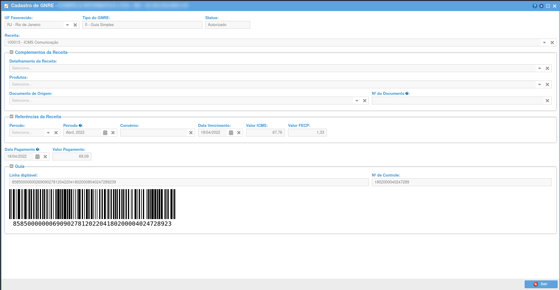 Se entrarmos na Guia após a autorização, aparecerá a aba "Guia" com a linha digitável e o código de barras.