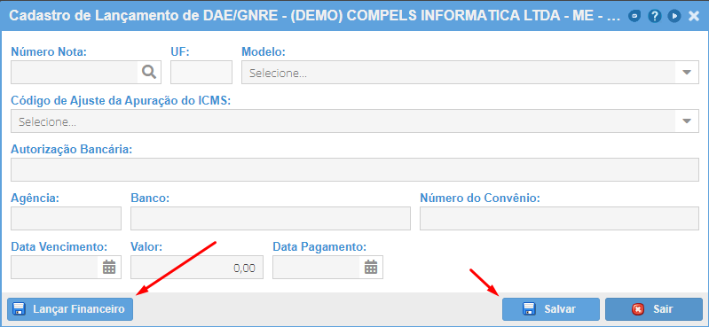 Preencha os campos conforme imagem abaixo, clique em "Lançar Financeiro" e depois "Salvar".