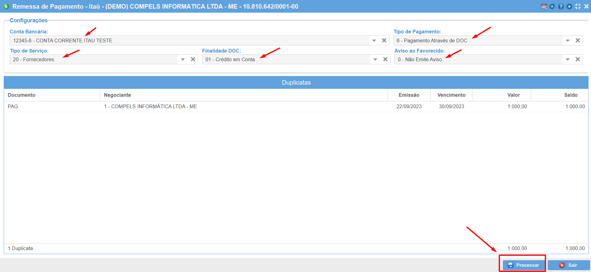 Assim que localizar a duplicata/documento, selecione a mesma e clique em "Processa Remessa".